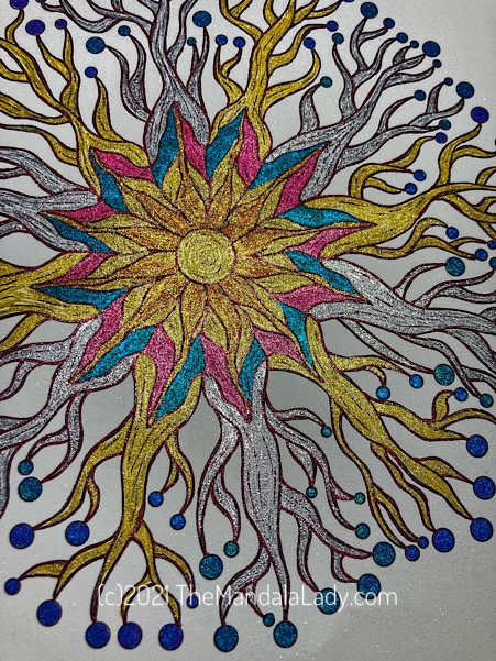 Here’s my first attempt at coloring this mandala using 8 different glitter pens. The second image shows off the glitter better. I plan to color this multiple times throughout the year. Maybe you can too.