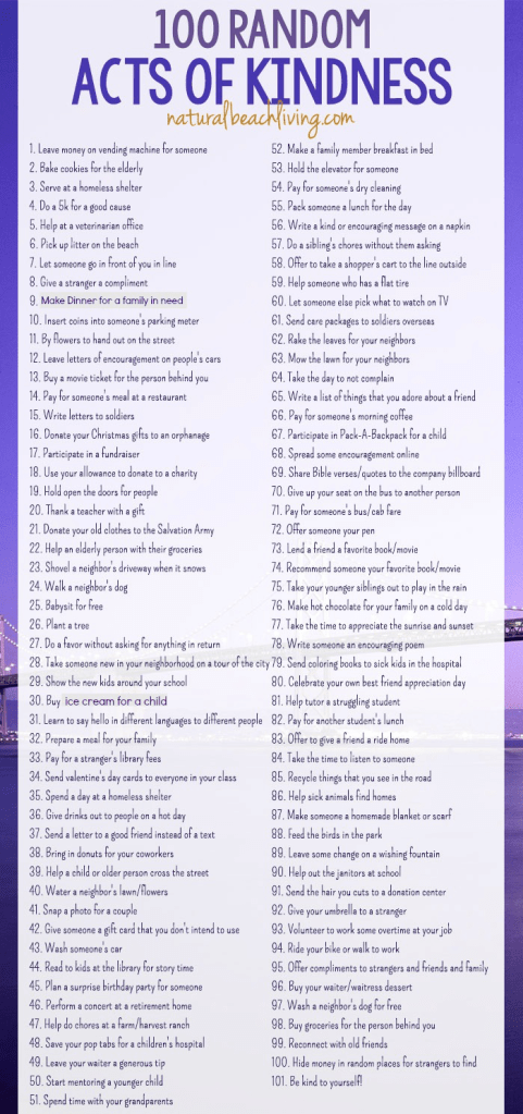 If you need some ideas for simple acts of kindness visit RandomActsofKindness.org or here’s an image of their list.